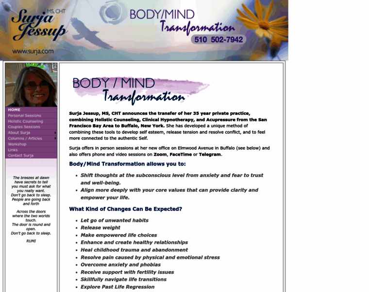 Surja Jessup, hypnotherapist in Berkeley, CA utilizes Body/Mind Transformation which combines HYPNOTHERAPY, COUNSELING, ACUPRESSURE and healing body work to dissolve tension, resolve conflict, and experience the natural joy and aliveness of the authentic self