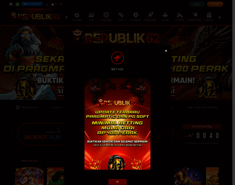 REPUBLIK62 adalah situs game online remsi paling sensasional satu Indonesia yang menyediakan berbagai game online yang pastinya gampang menang yang pastinya merupakan situs game online resmi terbaik dan terpercaya. Daftar dan login REPUBLIK62 sekarang, karena seluruh kemenanganmu dijamin terbayarkan.