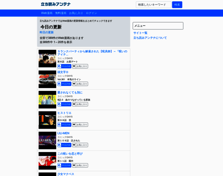 立ち読みアンテナはWeb漫画や1巻無料・増量漫画などの更新情報をまとめたアンテナサイトです。著作権をクリアしたサイトだけをまとめてるので、安心してご利用ください。会員登録することでお気に入りの漫画を簡単にチェックする事もできます。