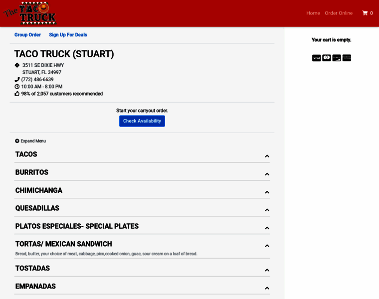 Online ordering menu for TACO TRUCK. Bienvenidos a the Taco Truck of Stuart, FL. We are located off the coast near Witham Field. We carry the best of Mexico in a food truck! From Taco's and Burrito's to Chimichangas and Tortas. You can buy single Tamales or bundle them in 5's or 10's. We are well known in the area and our reviews show that! Come find out what the hype is about! Order Now!