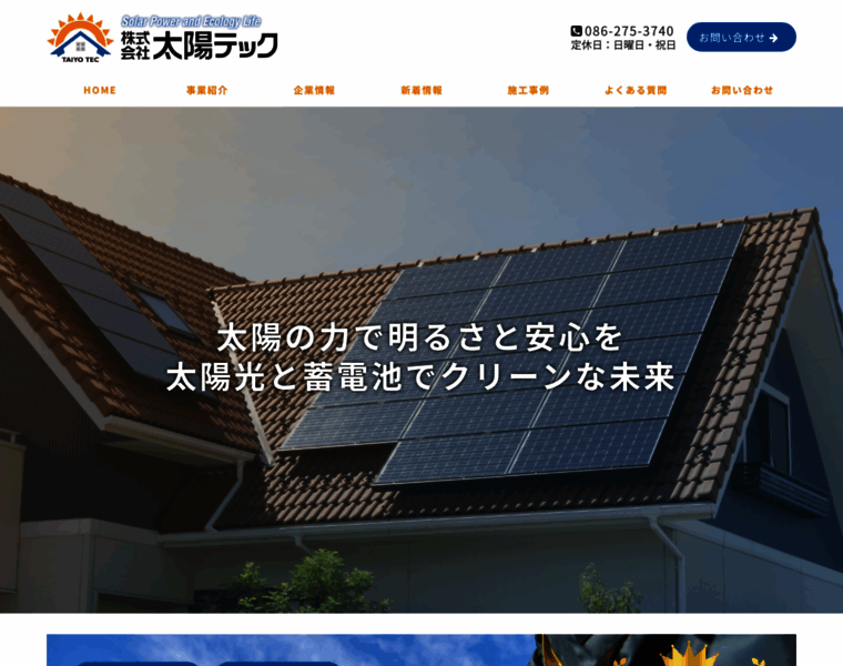 太陽テックは岡山市を拠点として、太陽光発電システム事業・蓄電池の設置工事・リフォーム事業・住宅設備機器(オール電化)事業を行っております。打ち合わせから施工・アフターフォローまで対応できる体制を整えておりますので安心しておまかせください!