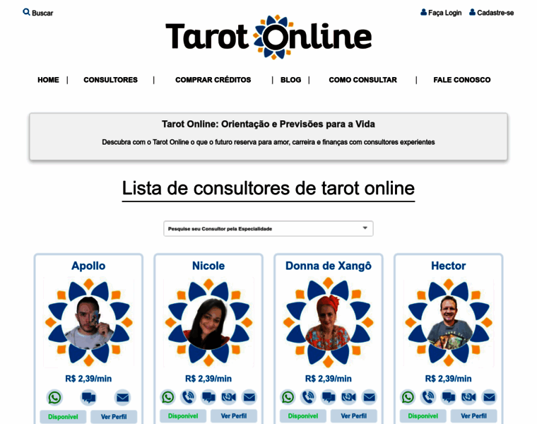 Realize sua consulta agora na Tarot Online Esoterismo. Escolha seu consultor, defina o canal (Telefone, WhatsApp, Chat, Vídeo ou E-mail) e tenha respostas imediatas.