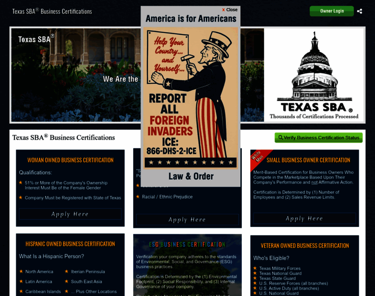 Texas SBA® Business Certifications: Woman-Owned, Minority-Owned, Veteran-Owned, Hispanic-Owned, Family-Owned, ESG Certification. Great Marketing Tool; Verifies Ownership; Personalized QR Code; Signed Certification Letter; Apply Online; Fast Processing. Texas SBA®
