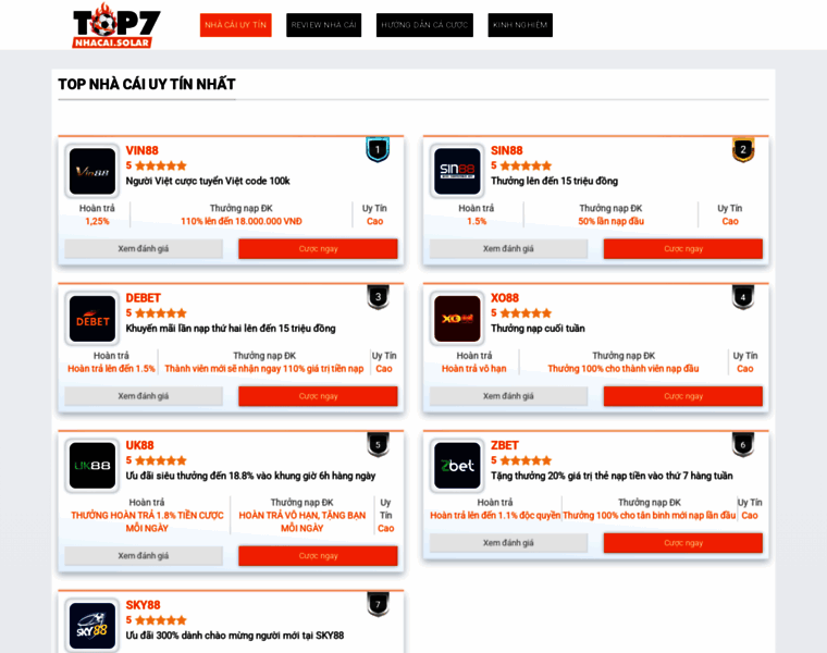 Top 7 nhà cái uy tín nhất Việt Nam - Top nhà cái: Vin88, SIN88, DEBET, XO88, UK88, ZBET, SKY88, về đa dạng: cá cược bóng đá, game bài, xóc dĩa,...