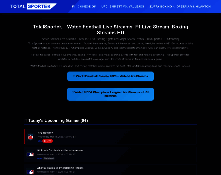 Watch Football Live Streams, Premier League, Champions League, La Liga, Serie A, Bundesliga and more on TotalSportek. Stream Formula 1 races and boxing fights live online in HD with updated schedules and free sports streaming links.