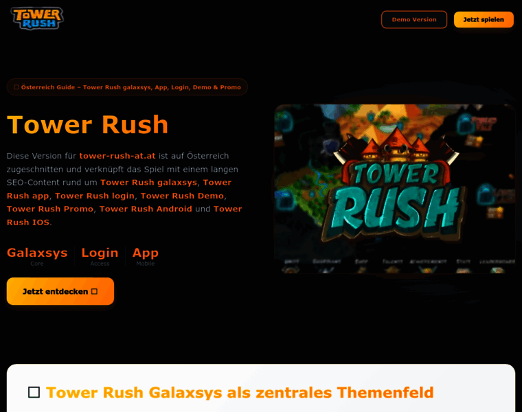 Tower Rush Österreich auf tower-rush-at.at: deutsche Landingpage mit Tower Rush Galaxsys, App, Login, Demo, Promo, Android und IOS im langen Tailwind-Casino-Stil.