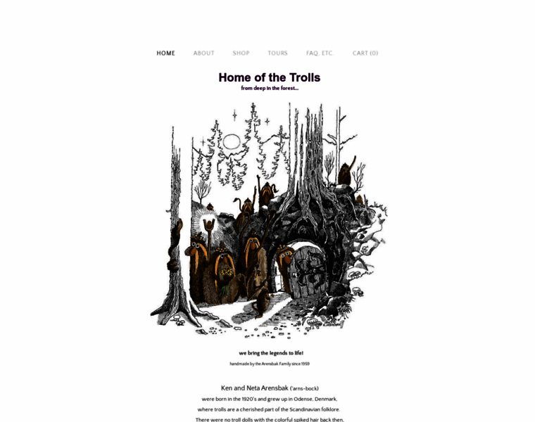 Home to the Trolls of 5 Arts Studio, handmade by the Arensbak family for over 55 years. Learn about these life-like trolls, this Danish-American family, and also how to find one of your own.