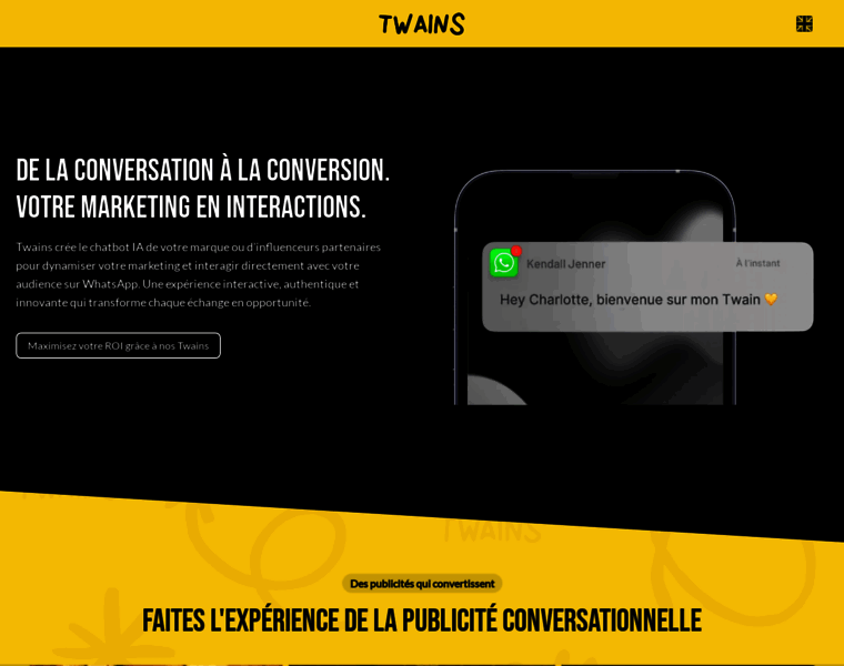 Twains crée le chatbot IA de votre marque ou d'influenceurs partenaires pour dynamiser votre marketing et interagir directement avec votre audience sur WhatsApp. Une expérience interactive, authentique et innovante qui transforme chaque échange en opportunité.