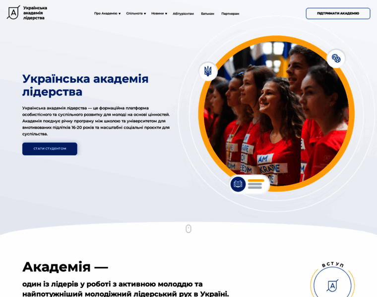 Українська академія лідерства — це формаційна платформа особистісного та суспільного розвитку для молоді на основі цінностей. Академія поєднує річну програму між школою та університетом для вмотивованих підлітків 16-20 років та масштабні соціальні проєкти для суспільства.
