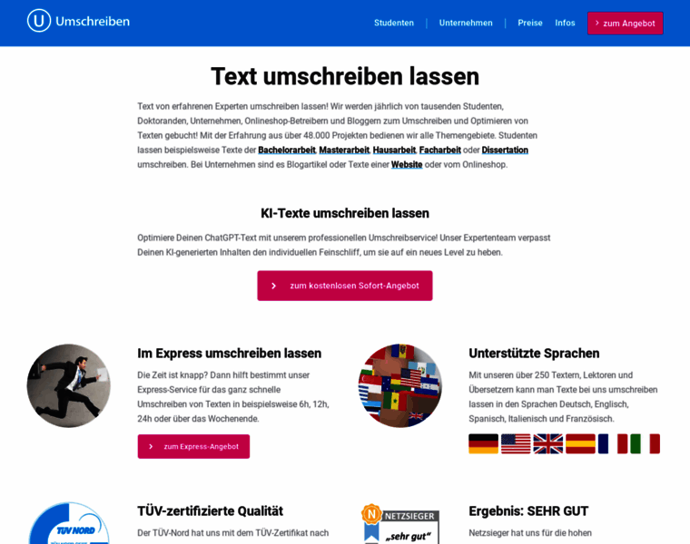 Text umschreiben lassen: Service zum Umschreiben von Text für Studenten, Unternehmen, Autoren auf Deutsch, Englisch, Französisch, Spanisch, Italienisch und Express.