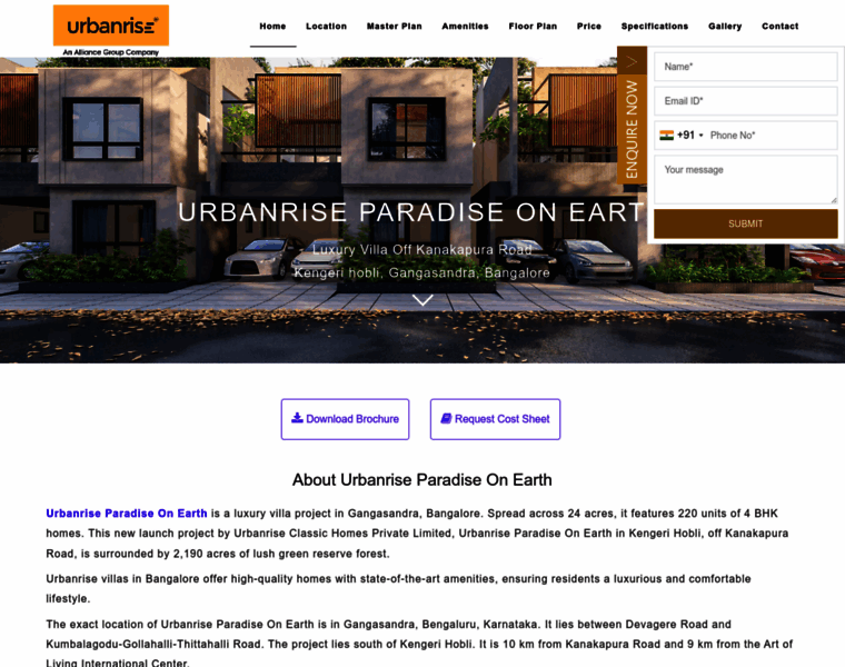 Urbanrise Paradise On Earth is located strategically on Gangasandra, Off Kanakapura Road, Bangalore. It is a luxury villa by Urbanrise Classic Homes Private Limited. Spread across a 24-acre plot, It offers 220 Villa Units of 4 BHK houses.