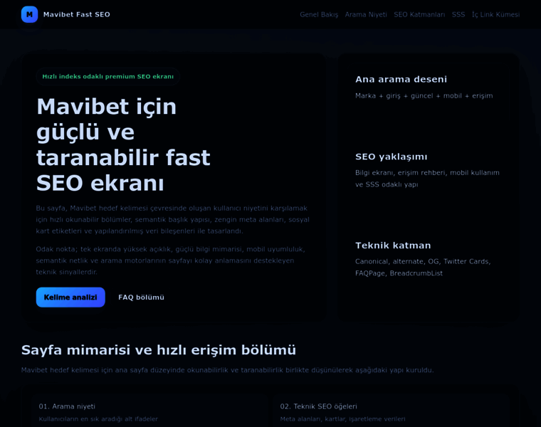 Mavibet odaklı hızlı SEO ekranı: güncel erişim, mobil kullanım, hesap adımları, güvenlik, sık sorulan sorular ve taranabilir güçlü sayfa mimarisi tek ekranda sunulur.