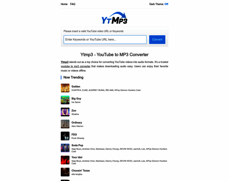 Ytmp3 is an online YouTube to MP3 converter that offers fast, high-quality audio downloads from YouTube videos. Compatible with all devices and browsers.