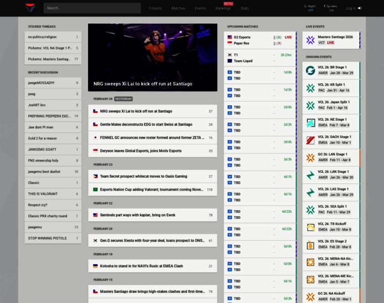 Valorant esports coverage - competitive news, schedule, match results, team rankings, stats, and forums
