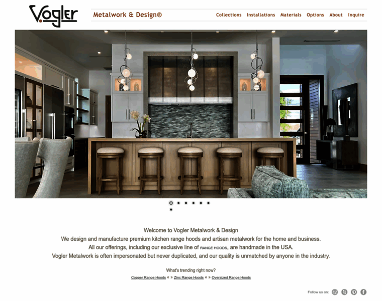 Vogler Metalwork & Design is the premier custom range hood maker in the U.S.A. We design and manufacture custom range hoods from high-quality, heavy gauge metals (copper, stainless, zinc, pewter, brass, bronze), as well as other metal architectural elements like fireplace hoods, chimney pots, and metal countertops. All our work is 100% designed and manufactured in the USA. Call (812) 615-0042 to place your order or inquire about our products and ...