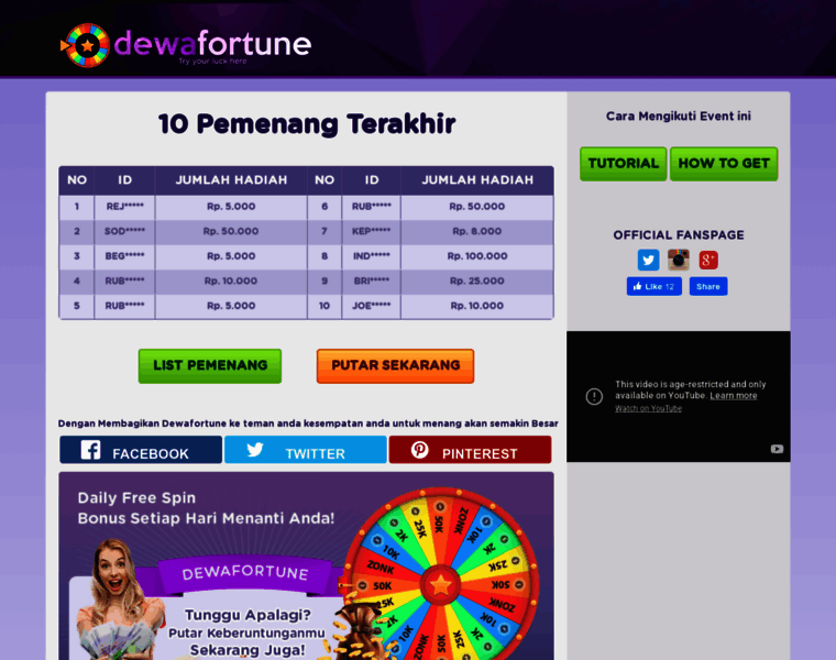 Dewafortune penyedia layanan lucky spin untuk pecinta game online. Penghargaan reward diberikan melalui spin keberuntungan. Gratis tidak dipungut biaya.