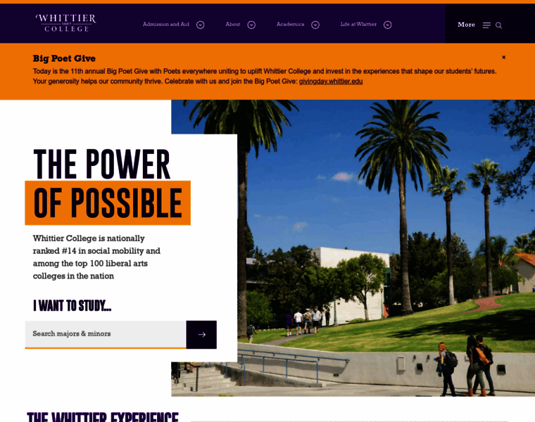Whittier College is a 4-year private liberal arts college located in Southern California between bustling Los Angeles and beautiful Orange County.