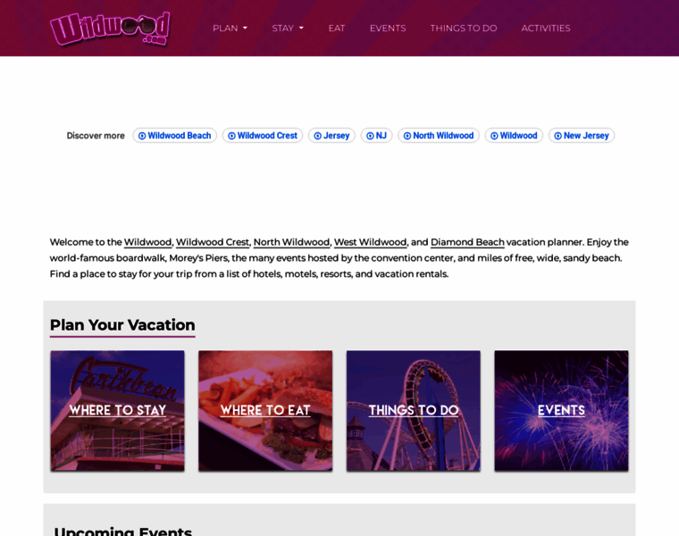 The Wildwood, Wildwood Crest, and North Wildwood, New Jersey vacation planner is the complete guide to hotels, motels, and vacation rentals. Find information on Wildwood, NJ restaurants, real estate, shopping, and events.