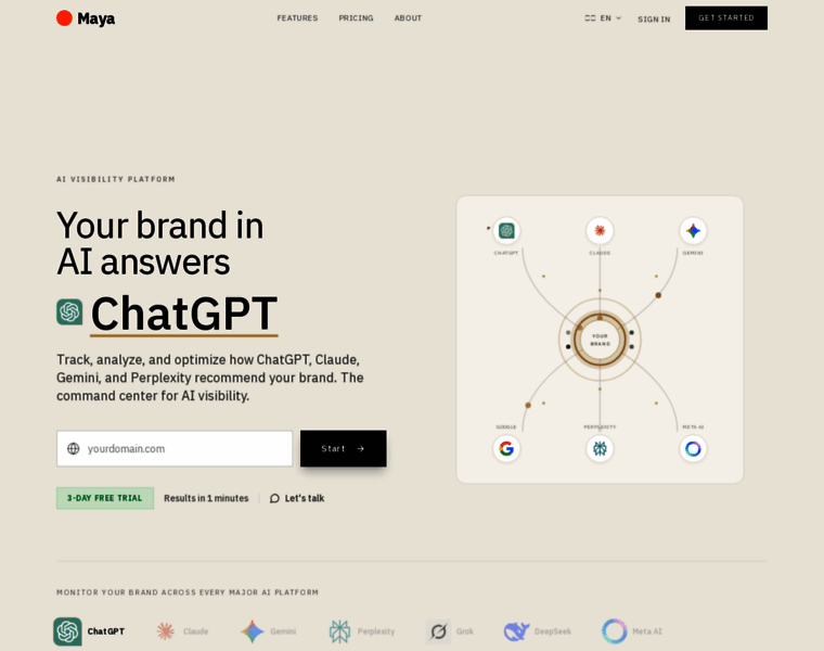 Maya helps brands track, analyze, and improve their visibility in AI search engines like ChatGPT, Claude, Gemini, and Perplexity. Monitor LLM visibility, sentiment, and share of voice – and get actionable GEO recommendations.