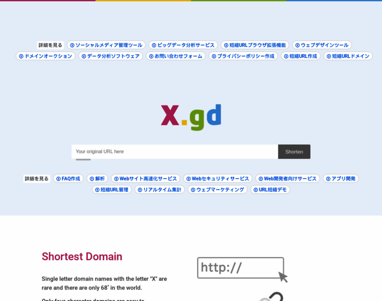 X.gdは長いURLを短く変換する完全無料で登録不要の短縮URL発行サービスです。QRコード発行やアクセス解析にも対応しています。