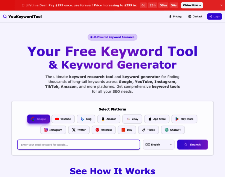 Free keyword tool for keyword research across all platforms. Use our keyword generator to discover long-tail keywords for Google, YouTube, Bing, TikTok, Amazon & more. Best keywords tool for SEO.