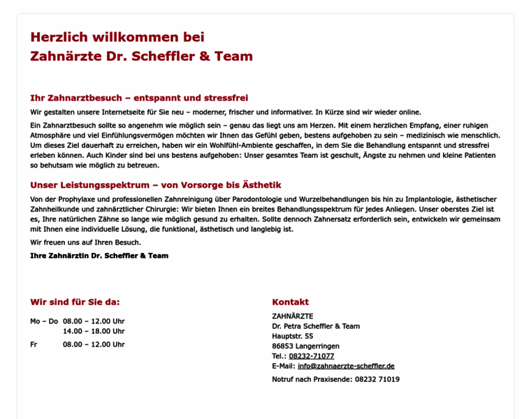 Zahnarztpraxis Dr. Scheffler in 86853 Langerringen - Moderne Zahnmedizin mit persönlicher Betreuung. Online-Terminbuchung, digitale Anamnese und umfassende zahnärztliche Behandlung für die ganze Familie.
