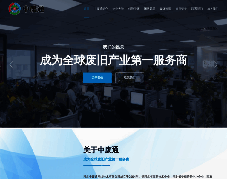 中废通网络技术(河北)有限公司,公司创立于2004年,是废旧物资电子交易平台(feijiu.net)的开拓者与领导者,再生资源行业龙头企业。旗下拥有优盛二手设备网,聚拍网,中国废旧金属网,中国废纸网,再塑宝五大平台。公司承诺让废旧生意交易更轻松、打造废旧行业一条龙的服务、为客户创造更大价值。