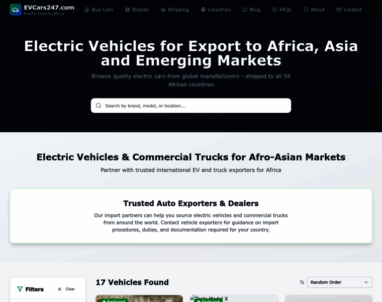 Africa’s Trusted Source for Electric Vehicle Imports — EV Cars Delivered Anywhere, 24/7: Algeria, Angola, Benin, Botswana, Burkina Faso, Burundi, Cabo Verde, Cameroon, Central African Republic, Chad, Comoros, Republic of the Congo, Democratic Republic of the Congo, Côte d’Ivoire, Djibouti, Egypt, Equatorial Guinea, Eritrea, Eswatini, Ethiopia, Gabon, Gambia, Ghana, Guinea, Guinea-Bissau, Kenya, Lesotho, Liberia, Libya, Madagascar, Malawi, Mali, M...