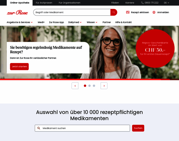 Zur Rose ist eine der führenden Online-Apotheken in der Schweiz mit einem grossen Sortiment an Medikamenten. Kostenfreier, diskreter Versand und hohe Medikamentenverfügbarkeit – bequem von zu Hause aus bestellen und pharmazeutische Beratung erhalten.