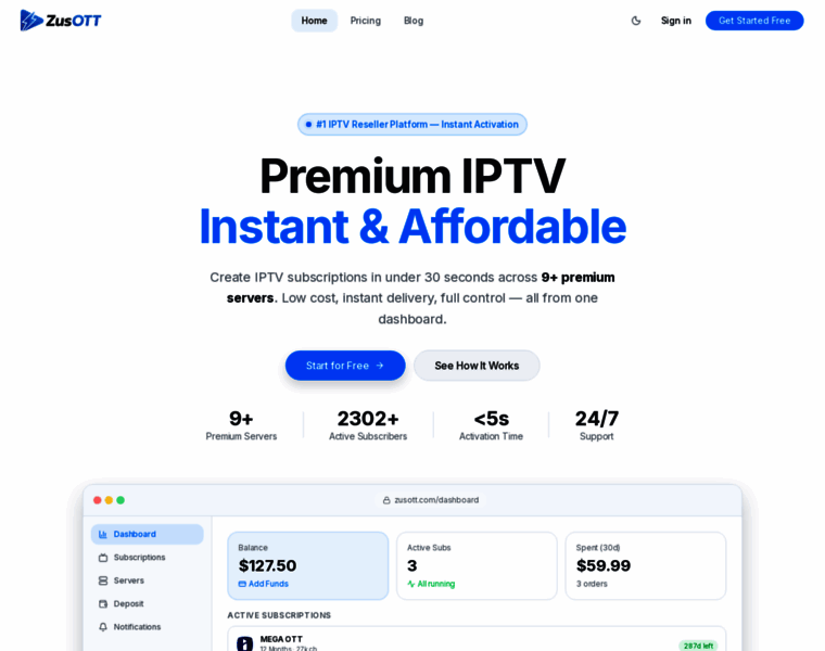 ZusOTT offers premium IPTV subscriptions across multiple servers. Get live TV, VOD, and instant activation — all managed from one simple dashboard.